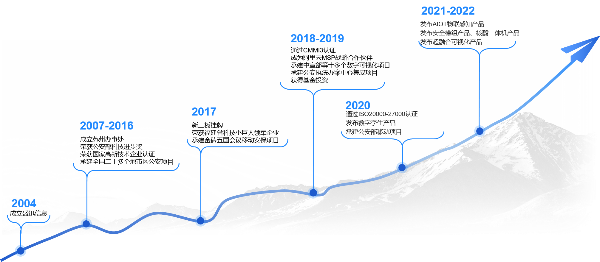 自2009年起,以技術創新為導向的盛迅信息先后通過雙軟認證、ISO9001、ISO20000、ISO27001、OHSMS18001管理體系認證及及CMMI3評估認證。作為國家認定的高新企業,公司積極參與全國多地的智慧城市、數字政府的相關建設,主要包括福建省數字哨兵一體化疫情防控平臺建設、福建省核酸防疫一體機開發、浙江省反走私智慧綜治建設、杭州亞運會奧體中心一體化管控平臺建設、中宣部輿情指揮中心建設、杭州城市大腦建設、廈門金磚五國領導峰會安保建設等,多項產品得到省部級科技創新獎項。通過長期努力積累,依托夯實的技術研發和行業積累,目前公司已擁有八十多項軟件著作權證書,成功入選福建省科技小巨人領軍企業。